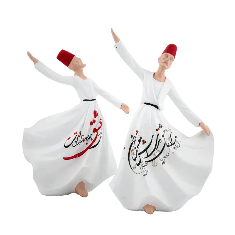 This 16cm Calligraphy Sama Dance sculpture embodies the beauty of Persian mysticism and artistry. Inspired by the spiritual whirling of dervishes, this handcrafted piece captures the essence of devotion, poetry, and elegance. The white attire, paired with a red hat and black belt, reflects the traditional attire of Sama dancers, evoking a sense of harmony and spiritual transcendence.