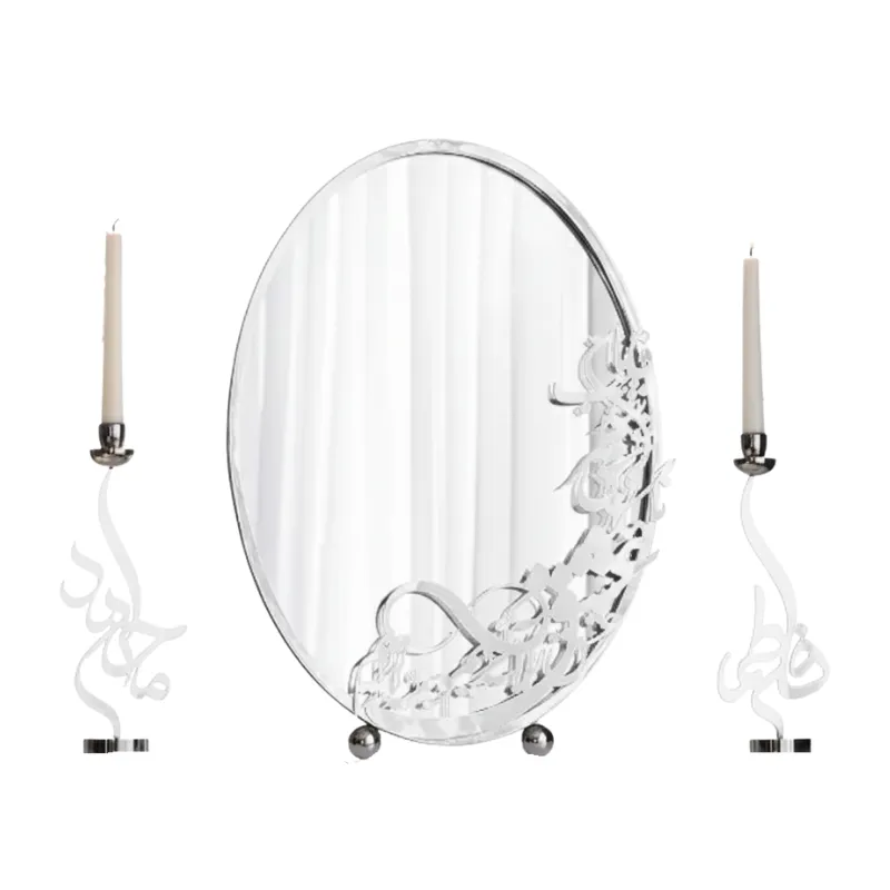 Enhance the ambiance of your home with the Luxury Iron Mirror and Candle Holder Set with Poetic Engraving – Silver. Expertly crafted to combine tradition with modern elegance, this set is ideal for those who appreciate artistic beauty and timeless design. Whether gracing your living room or adding grandeur to your Persian wedding table, the set embodies cultural richness and aesthetic appeal. The silver iron frame highlights the intricate work of master artisans, while the poetic engravings provide a personal, artistic touch, making this set a true statement piece.