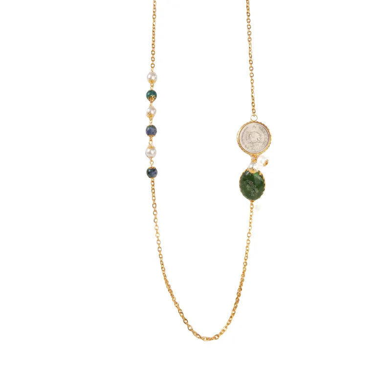 The Elegant Jade and Pearl Coin Necklace from Persis Collection is an exquisite fusion of Persian artistry and contemporary design. Crafted with jade stone, cultured pearls, and gold-plated nickel, this necklace celebrates Persian heritage and elegance. The gold-plated coin at the center ties the piece to ancient Persian culture, making it a unique and meaningful addition to any jewelry collection.