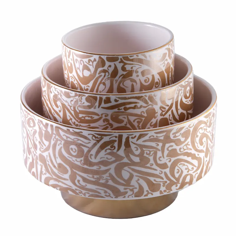 Every bowl in this decorative ceramic bowl set is carefully crafted with a high-gloss glaze finish and gold-trimmed edges. Resting on elegant brass bases, the three bowls—each in a distinct size—are perfect for serving sweets, fruits, or snacks during Nowruz, Haft Seen setups, or any special occasion. The transfer-printed golden design evokes traditional Persian calligraphy, blending poetic beauty with practical utility. These luxury ceramic bowl décor pieces are not only functional but visually stunning.