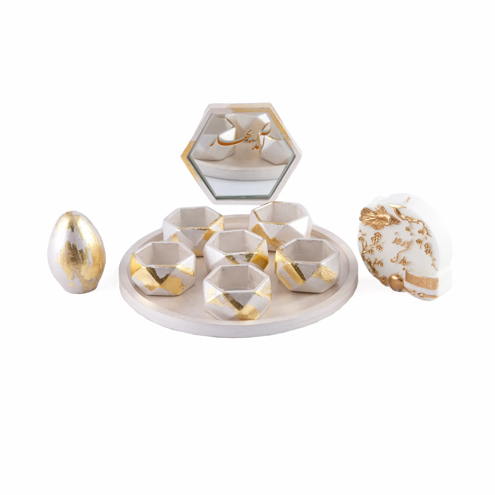 The gold leaf accents add a luminous touch, transforming this Persian Nowruz decor into a statement of refined artistry. Each miniature bowl measures approximately 3 cm in height and 5 cm in diameter, harmonizing perfectly with the tray’s proportions. The mirror, sized at 10 × 11.5 cm, and the decorative egg standing at 7 cm tall, complete the ensemble with balanced elegance.