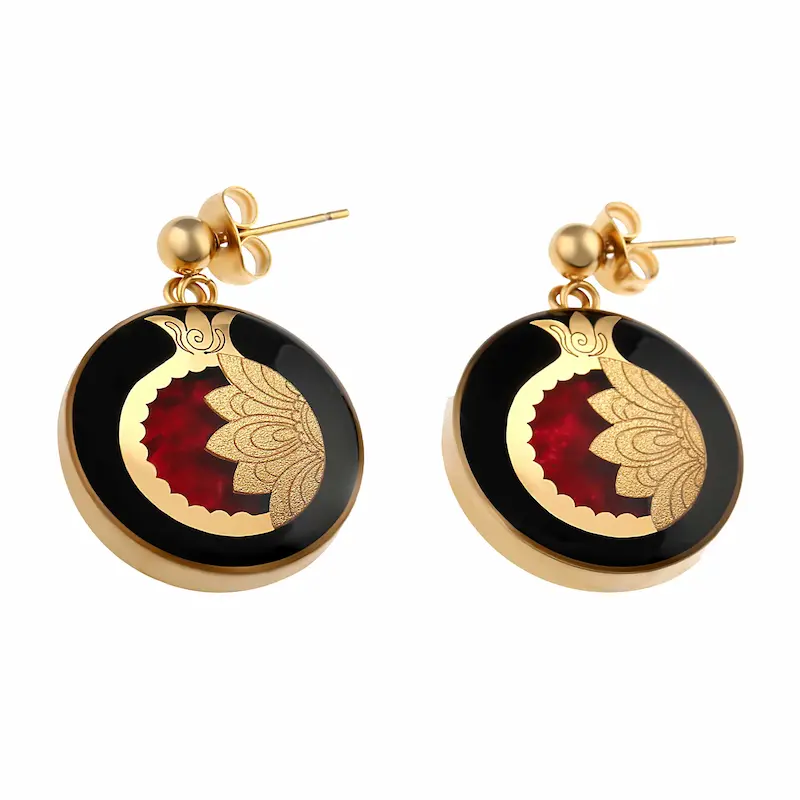 Celebrate Persian heritage with these Persian earrings, beautifully designed to capture the essence of Yalda Night and its symbol of renewal—the pomegranate. Each pair combines 24K gold leaf artistry with the deep red glow of natural jade, representing love, vitality, and abundance. These Persian Gold Earrings are part of the exclusive Persian Jewelry collection, blending ancient craftsmanship with modern beauty. The luminous gold surface glistens under any light, while the vibrant pomegranate design connects you to centuries of Persian culture and tradition.