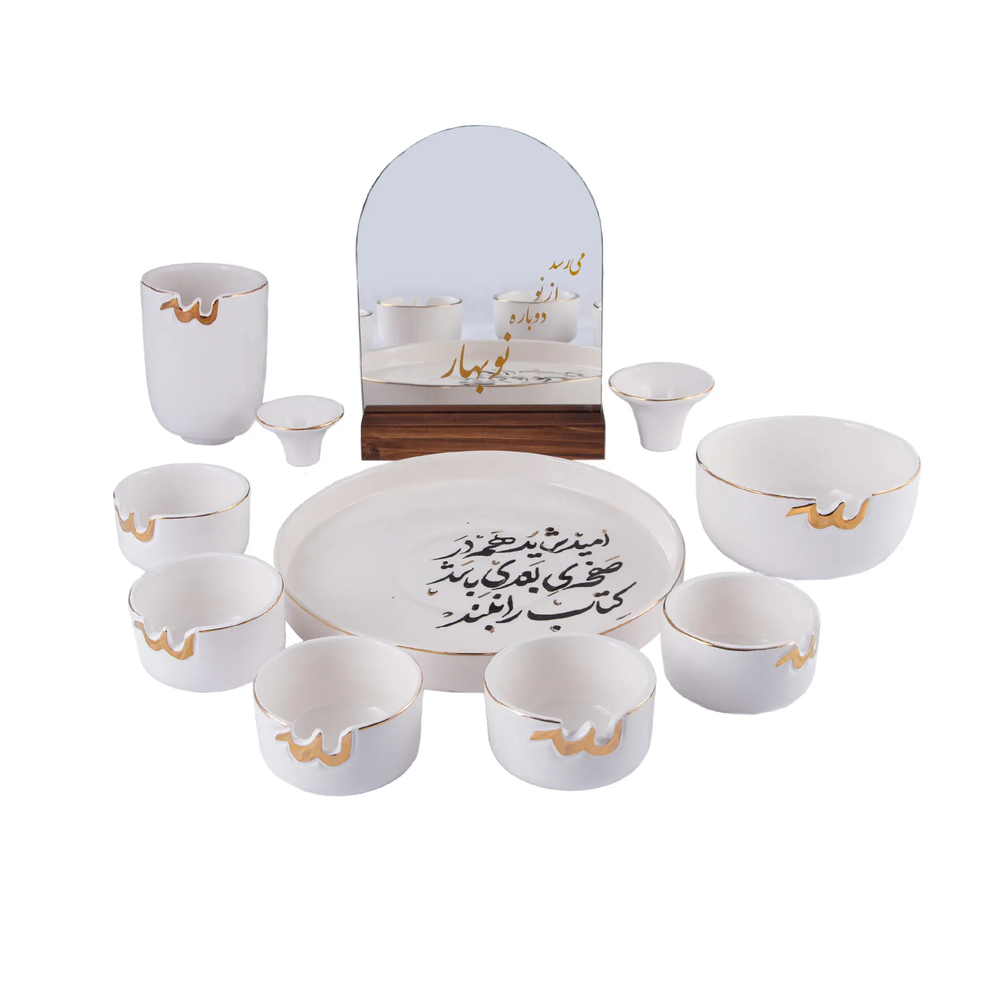 Every piece in this Nowruz Ceramic Set Handmade collection is both beautiful and practical. The set is washable (hand-wash recommended), allowing you to enjoy it year after year. With the quote on the tray, “امید شاید هم در صفحه ی بعدی باشد کتاب را نبند,” this set invites you to begin the year with hope, making it one of the most elegant haft seen display pieces available. It’s more than just Persian holiday decorations—it’s an heirloom in the making.
