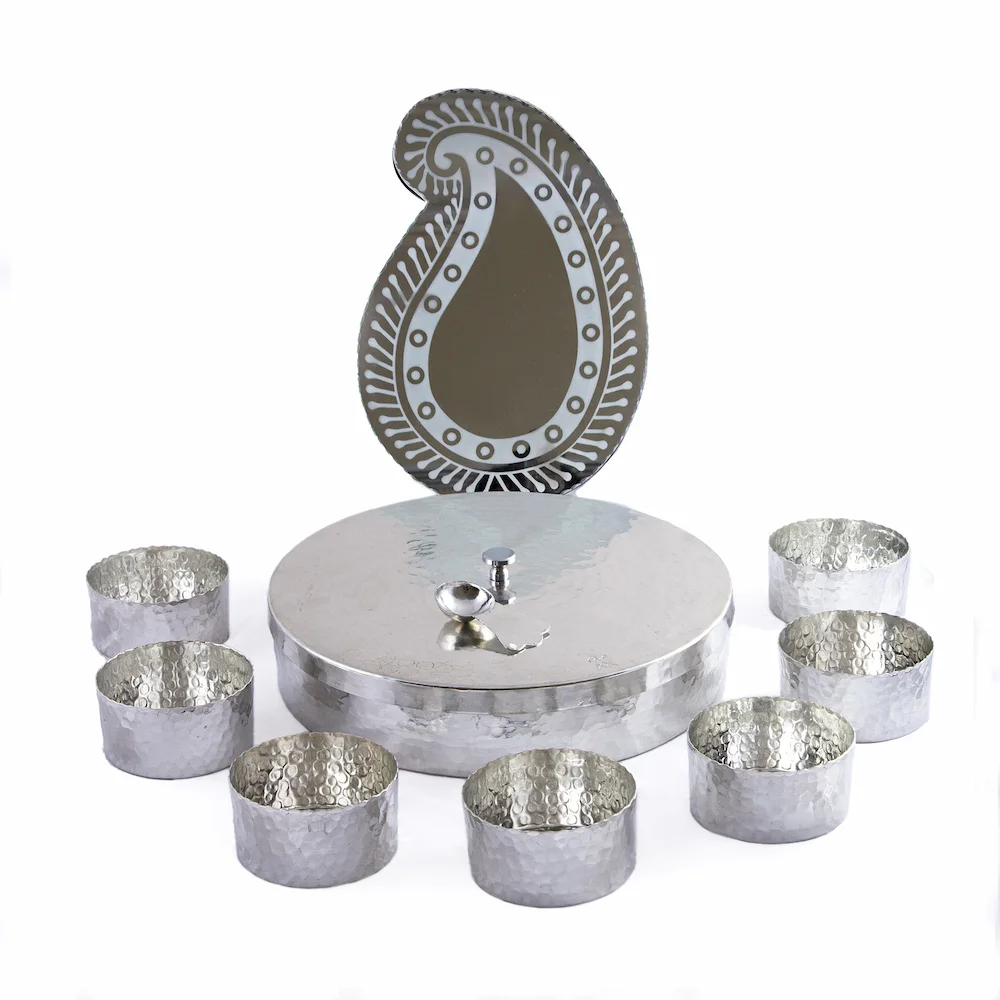 Artisans handcraft the limited-edition ‘Seven Skies’ design from hammered, tin-plated copper, featuring seven elegant bowls, a lidded centerpiece, a spoon, and a paisley mirror in a silver-toned finish. It’s more than a decorative piece; it’s a story told through metal, echoing centuries of celebration and renewal.