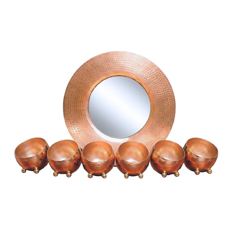 Crafted from high-quality hammered copper and polished to perfection, this set captures the natural radiance of the copper, ensuring both durability and beauty. The set includes a striking 35 cm hammered copper mirror, which serves as the centerpiece of your Haft-Seen display. This mirror’s reflective surface adds depth and brightness, symbolizing self-reflection and clarity—essential elements of the Nowruz tradition.