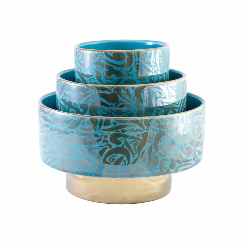The Handcrafted Turquoise Persian Calligraphy Bowl Set from the Persis Collection beautifully merges artistic heritage with practical sophistication. Each bowl features a stunning turquoise ceramic body, richly glazed and adorned with golden Persian calligraphy motifs. The brilliance of the gold-accented rims complements the hand-crafted copper pedestal bases, offering a regal presentation perfect for festive settings and daily elegance alike.