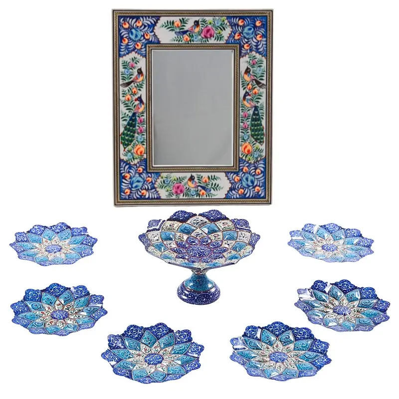 This set highlights Persian enamel craftsmanship with kiln-fired durability. The copper core and metal-oxide pigments provide lasting color and strength. Its enamel surface resists scratches and is easy to clean. The floral khatam mirror frame adds symbolic meaning for the Nowruz Sofreh and suits year-round décor. Each handmade piece is one-of-a-kind, perfect for collectors, gifts, or Persian homes worldwide.