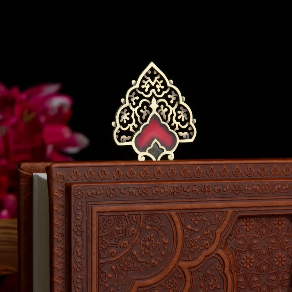 The Slimi Enamel Art Persian Bookmark is a timeless accessory for book lovers and collectors alike. Handcrafted with meticulous care, this bookmark showcases the elegant Slimi pattern, an iconic design in Persian art, etched onto high-quality brass. Its vibrant red enamel detailing adds a luxurious touch, making it a true piece of functional art.