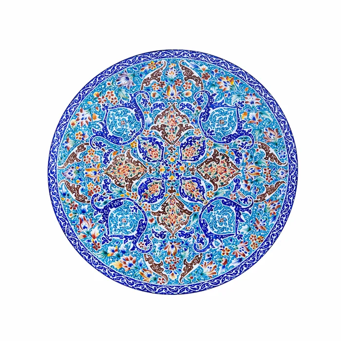 Each Persian Minakari Plate is meticulously hand painted by skilled artisans using time‑honored techniques of Persian enamel art. The copper base is carefully prepared to hold layers of vivid enamel colors, resulting in a smooth, radiant surface with remarkable depth. Because this is a fully handmade enamel plate, subtle variations in color and brushwork highlight its authenticity and artisanal value.
