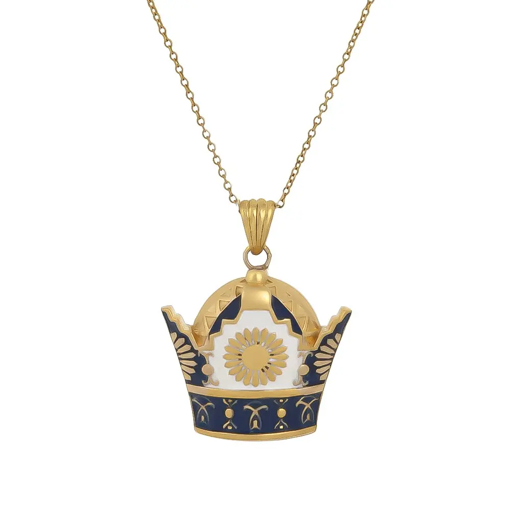 Crafted with symbolic depth and delicate detail, the Persian Gold necklace with a blooming sun motif is more than an accessory—it’s a radiant expression of heritage. Featuring a powerful sun-crown design, this pendant symbolizes illumination, power, and elegance. The unique floral-sunburst shape captures the spirit of traditional Persian gold jewelry, blending historical significance with contemporary charm. Finished with white and navy Minakari enamel, every curve tells a story of beauty born from culture.