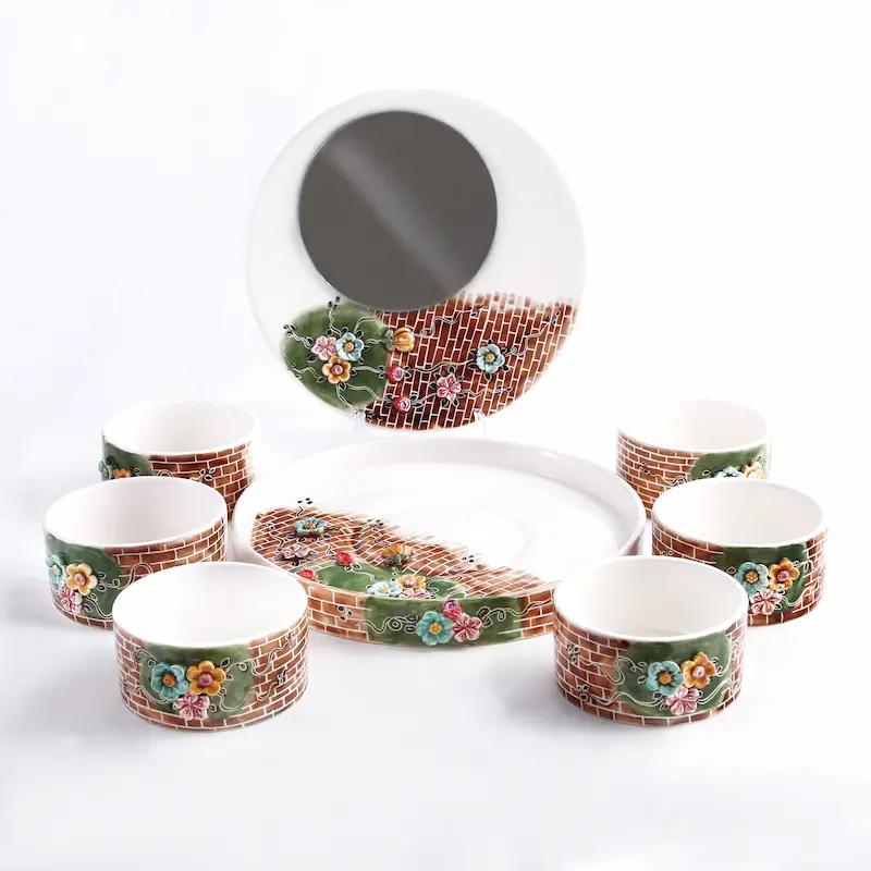 Each item in this Persian Haft Sin set is shaped and glazed by hand — no two pieces are alike. The set includes 6 painted bowls, a centerpiece mirror, an elegant tray, and a tall decorative vase. The standout feature is the intricate floral embossment, bringing depth and vitality to your Nowruz display. The tactile ceramic finish offers both durability and visual appeal, making it a timeless seasonal centerpiece.