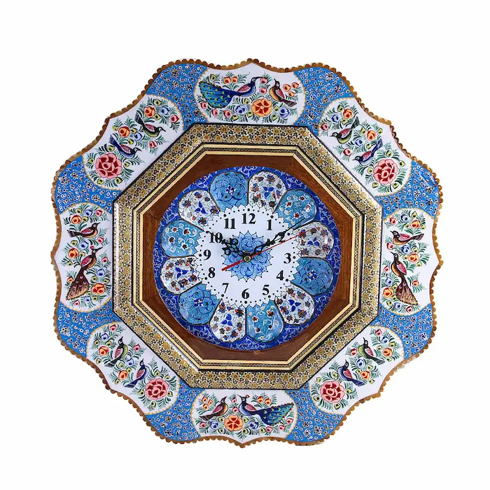 Handmade by skilled artisans from the Persis Collection, this piece honors the age-old art of Khatamkari. The precise geometry of inlaid wood, brass, and bone pairs beautifully with hand-painted enamelwork to form a rich and textured design. The Persian Minakari Clock technique breathes life into the vivid floral and bird theme, making each piece a true original.