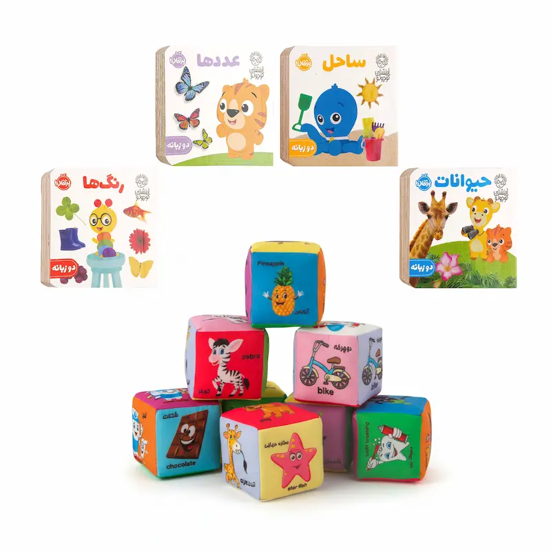 This unique gift box belongs to the most thoughtful Persian Gifts for Kids, combining educational tools with joyful playtime. The bilingual books (Persian-English) feature simple illustrations ideal for vocabulary development, while the square game cushions encourage visual recognition and motor skills. Whether you’re browsing for Persian baby gifts for birthdays, Nowruz, or special occasions, this set stands out as a meaningful and practical choice.