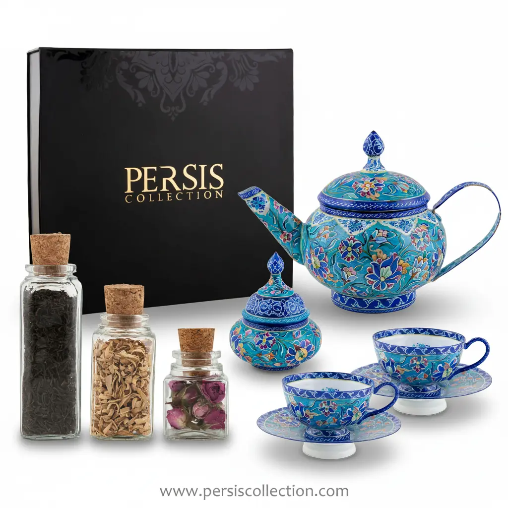 Artisan Persian Tea Gift Set for Two – Enamel Tea Service with Saffron & Floral Teas