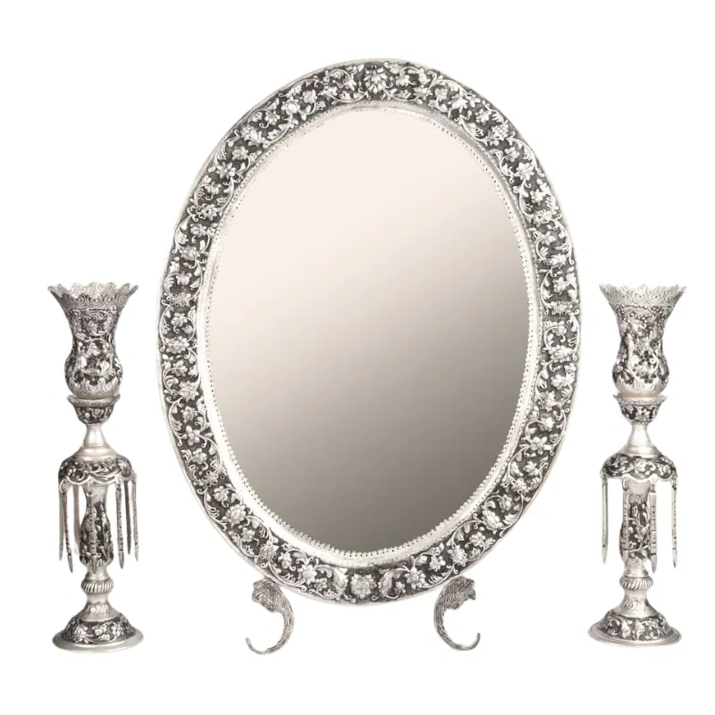 Crafted from high-quality silver, the Persian Oval Ayne Shamdoon epitomizes luxury and sophistication. The oval shape adds a touch of elegance, while the intricate Ghalamzani patterns mesmerize with their delicacy and precision. As the light dances across the silver surface, the mirror becomes a captivating focal point in any space, radiating beauty and charm.