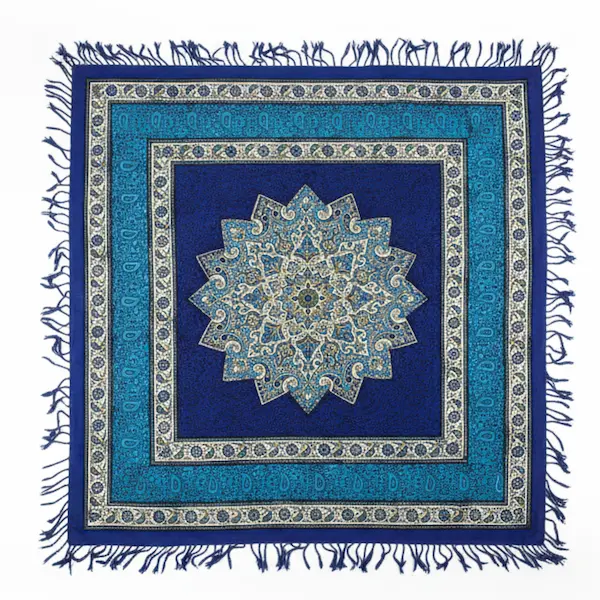 At the center of this design lies the خورشیدی (sunburst) motif, a powerful symbol in Persian culture. The deep lapis blue base is enriched with turquoise and golden borders, creating a rich, luminous contrast. Sized at 100×100 cm, this piece sits beautifully on square dining tables, side tables, or Persian tea spreads. It offers both function and a stunning statement of cultural identity. The colorfast dyes keep the lapis blue, turquoise, and gold tones vivid over time. Its fringed edges add traditional charm and protect the borders from wear. The textile is fully washable by hand or machine, making care effortless without fading or damage.