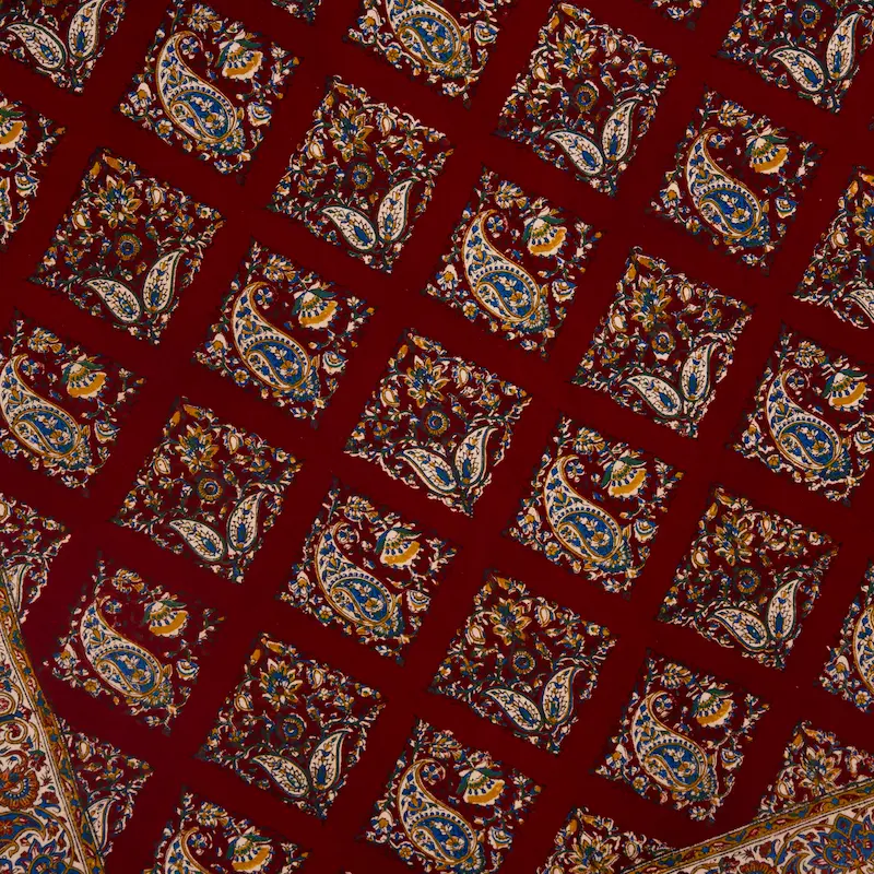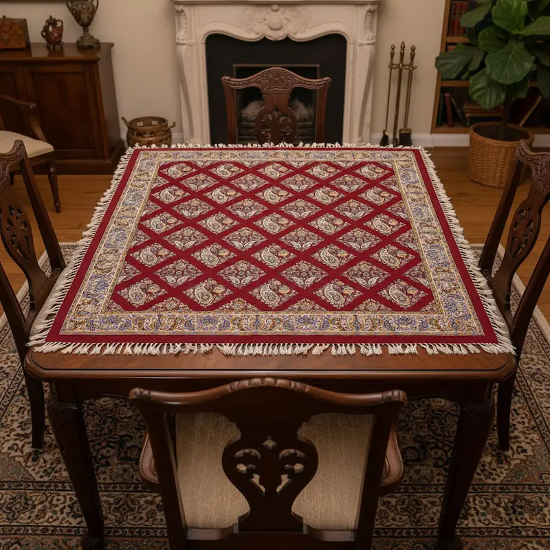 Step into the world of timeless Persian artistry with this handcrafted Persian Tablecloth, designed with a majestic red imperial pattern. Produced by Persis Collection, this 100×100 cm square cloth is made from durable cotton and features traditional Ghalamkar printing. Its deep red hue symbolizes both luxury and warmth, perfect for enhancing your dining or coffee table. With its color-fast finish and machine-washable fabric, this piece is both a cultural statement and a practical home accent.