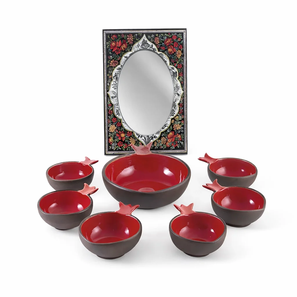 This exclusive Pomegranate Haft Seen Set includes six glazed ceramic bowls and one large centerpiece bowl. Each piece features traditional pomegranate-inspired motifs. A handcrafted wooden mirror, decorated with Persian designs and made using the decoupage technique, completes the set. Together, they add cultural depth and elegance to your Nowruz Table.