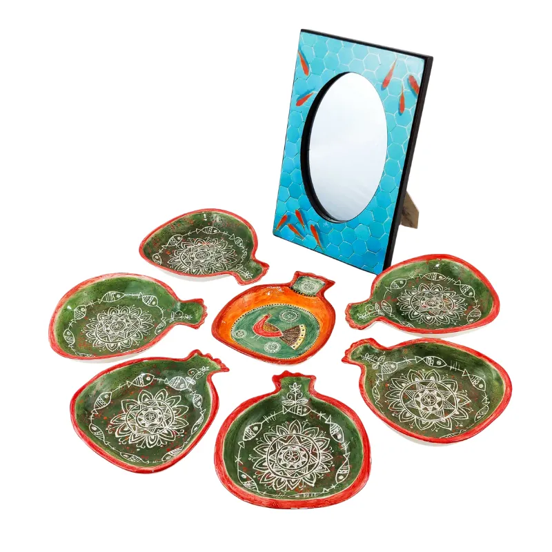 Each set includes 7 ceramic bowls (19.5 x 16.5 cm each) and a beautifully crafted wooden mirror (20 x 30 cm) using the decoupage technique on MDF wood, adorned with Persian designs. The ceramics are glazed at 950°C, ensuring both durability and elegance, ideal for hand washing and seasonal reuse.