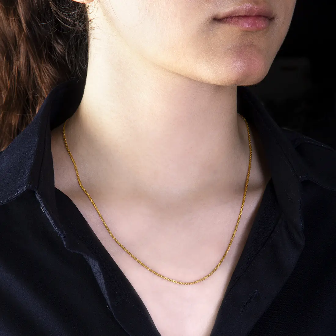 Introducing the Royal Bismarck Chain, a finely crafted 50cm Persian Necklace made of pure 18K gold. This elegant piece from the Persis Collection captures the essence of timeless beauty found in Persian Jewelry. With a weight of 2.7 grams and a flat, interwoven design, it lies gracefully on the neck — perfect for those who seek both subtle sophistication and cultural depth.