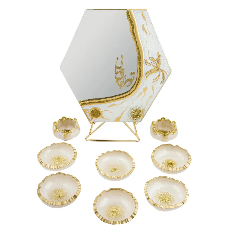 This set is produced by skilled Persian artisans who specialize in resin craftsmanship. Each piece is molded, polished, and finished by hand. The resin surface resists scratches and is easy to clean. The gold accents are sealed to preserve shine. The set is lightweight enough for table display yet durable for long-term use.