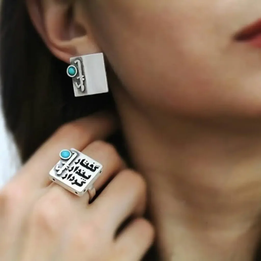 These Persian Earrings showcase artistry that goes beyond mere aesthetics. The meticulously cut inscriptions for “Good Thoughts, Good Words, and Good Deeds” give these earrings a unique depth, with each word thoughtfully arranged on the silver. The bold turquoise centerpiece adds a vibrant touch, symbolizing peace and positivity. The detailed design brings Persian values to life, perfect for those who appreciate cultural and symbolic jewelry.