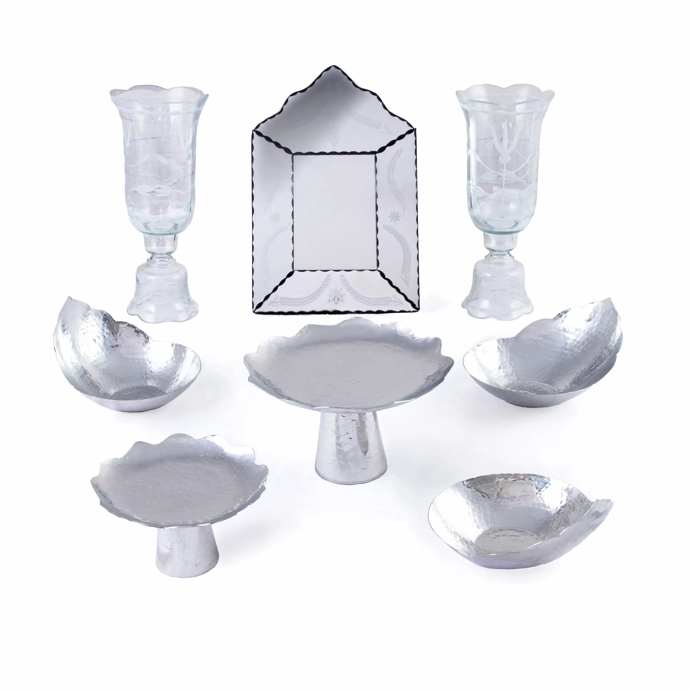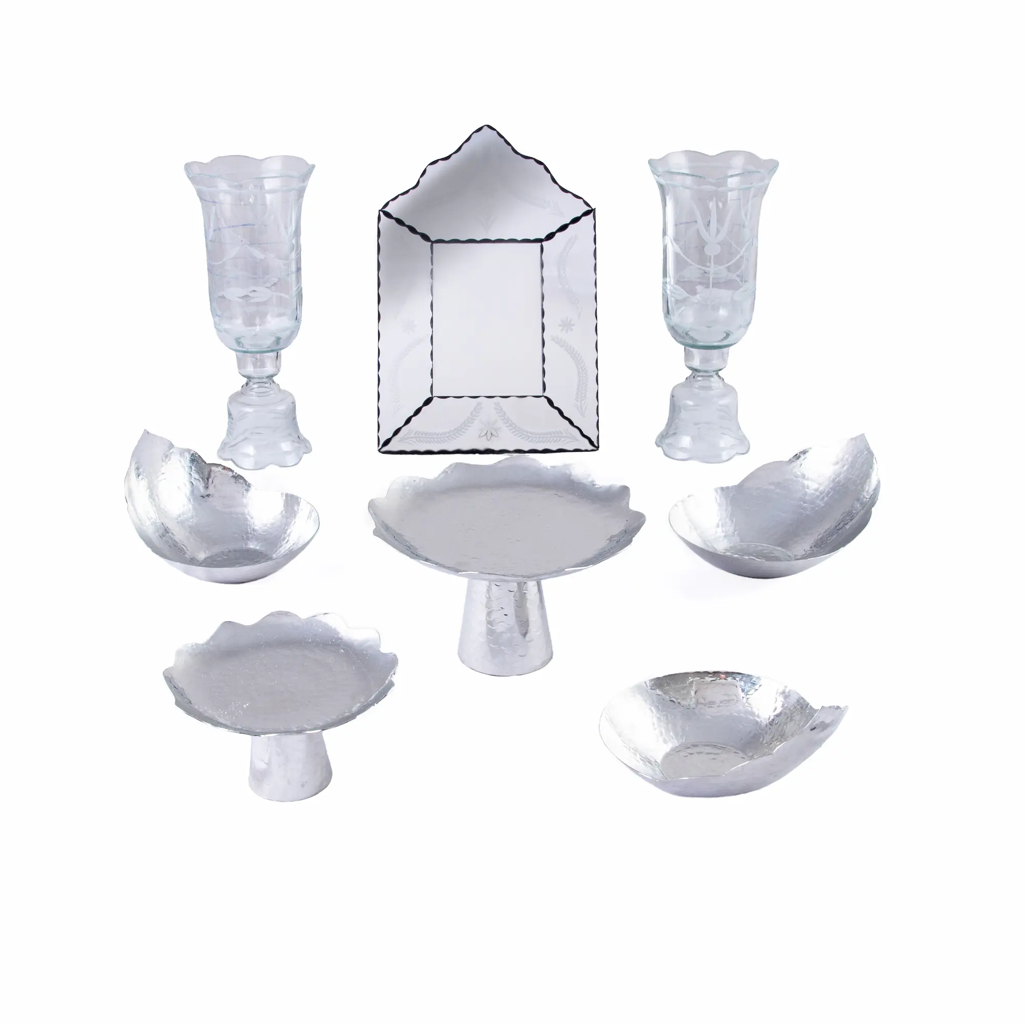 At the heart of this Persian Haft Seen arrangement lies authentic hammered copper, shaped and finished by skilled artisans. The set includes three crowned copper bowls with decorative scalloped edges, two pedestal serving dishes in large and small sizes, and a beautifully proportioned Venetian-style mirror adorned with a wheat motif symbolizing abundance. The laleh-style candlesticks feature carved detailing and refined edges, enhancing the depth and texture of the Haft Sin Table. The warm glow of copper creates a radiant focal point, capturing the essence of a truly luxurious haft seen set.