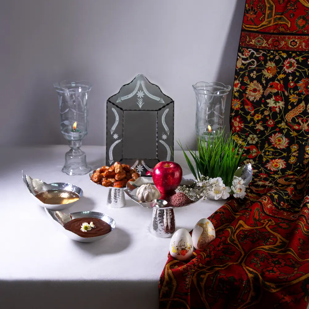 Each piece is proportioned for visual balance, ensuring your Persian Haft Sin Table feels harmonious and thoughtfully curated. The elevated pedestal dishes create dimension, while the crowned bowls add regal character. The Venetian mirror reflects candlelight beautifully, amplifying the sense of renewal and brightness that defines Persian Nowruz celebrations. This Persian Haft Sin set is not only decorative but also symbolic, designed to preserve tradition while fitting seamlessly into contemporary homes.
