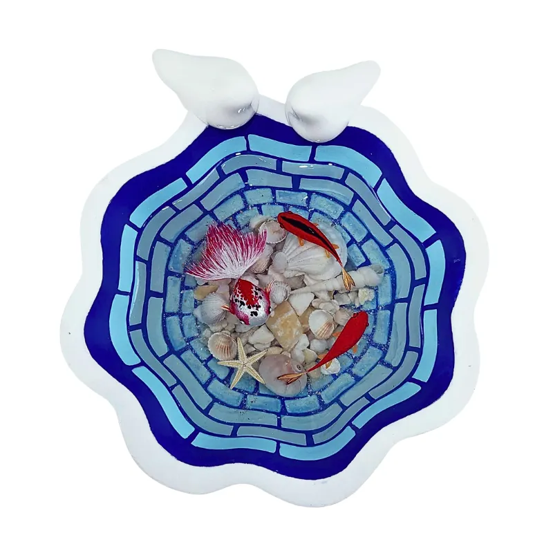Artist Zeinab Moeini brings traditional motifs to life using acrylic-resin paint and ceramic craftsmanship. The base features three-dimensional oysters and natural stones, creating a lifelike aquatic setting for the 3D Goldfish. A ceramic bird, measuring 5 cm in length, adds charm and storytelling to this symbolic piece rooted in Persian heritage.