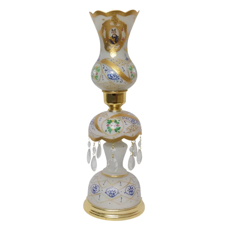 Step into the elegance of 19th-century Persia with the White Persian Laleh Lamps by Persis Collection. Each piece is handmade, showcasing traditional Persian craftsmanship through enamel floral detailing, gold gilt accents, and a historic vignette portrait of Nasser al-Din Shah Qajar. These Persian Table Lamps feature hand-painted shades and faceted prism drops that reflect light beautifully. Crafted from glass and brass, they bring both cultural legacy and luminous charm to any space.